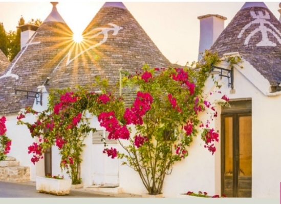 Café da manhã no hotel. Partida para Alberobello, a cidade dos Trulli, um patrimônio da Unesco com suas típicas casas de telhado cônico usadas como residências ou para armazenar ferramentas de trabalho. Visita a Alberobello e almoço em um restaurante local. À tarde, continue até Polignano a Mare, uma antiga vila de pescadores onde ainda se respira a atmosfera marítima. Suas casas brancas contrastam com o azul do Mar Adriático e seus inúmeros penhascos e varandas fazem dessa costa uma paisagem a ser admirada. Continue até Bari. Pernoite no hotel.